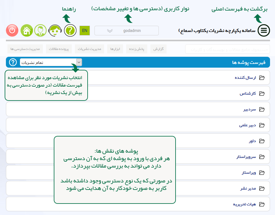 این سامانه به هر فرد تنها یک نام کاربری و رمز عبور اختصاص می دهد و با همان نام کاربری می تواند به همه نقش های خود در همه نشریات دسترسی داشته باشد. توضیحات هر بخش از این سامانه در تصاویر زیر ارایه شده است.نسخه اولیه این سامانه برای مقالات عرضه شده است. اما با داشتن امکان تغییر و تنظیم نقش ها و عناوین، امکان استفاده از آن برای بررسی هر نوع سندی وجود خواهد داشت.